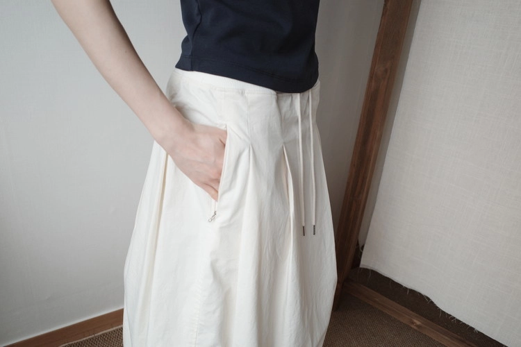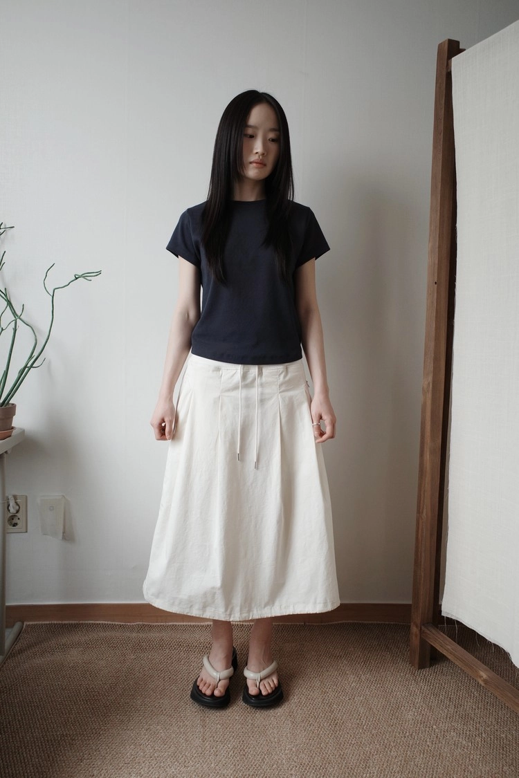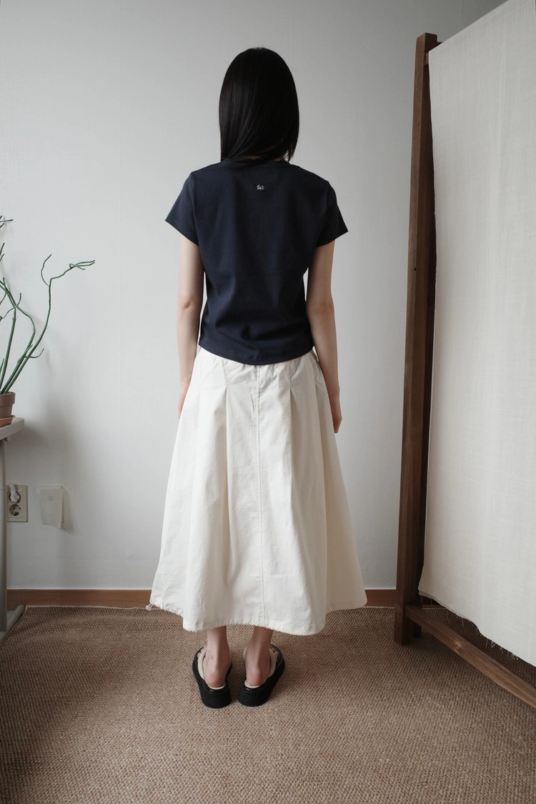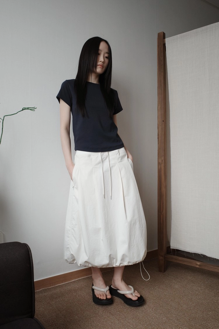 살짝 들어간 허리 라인과 라운드 처리된 밑단으로 슬림한 실루엣을 자연스럽게 살려주어,