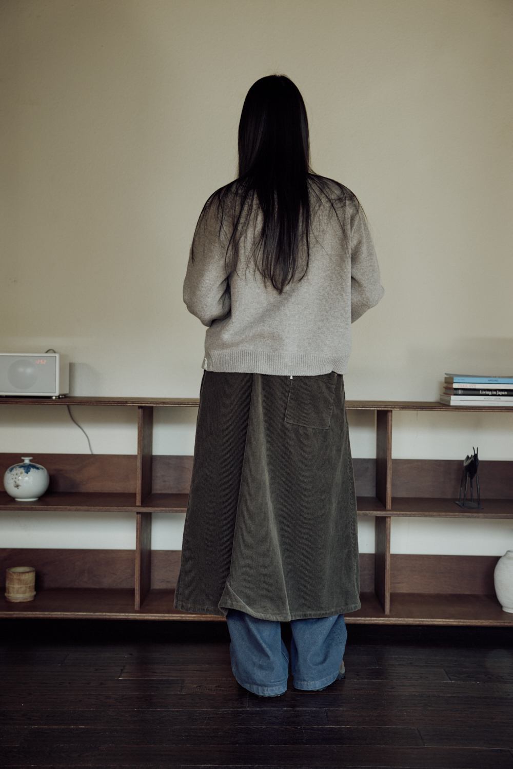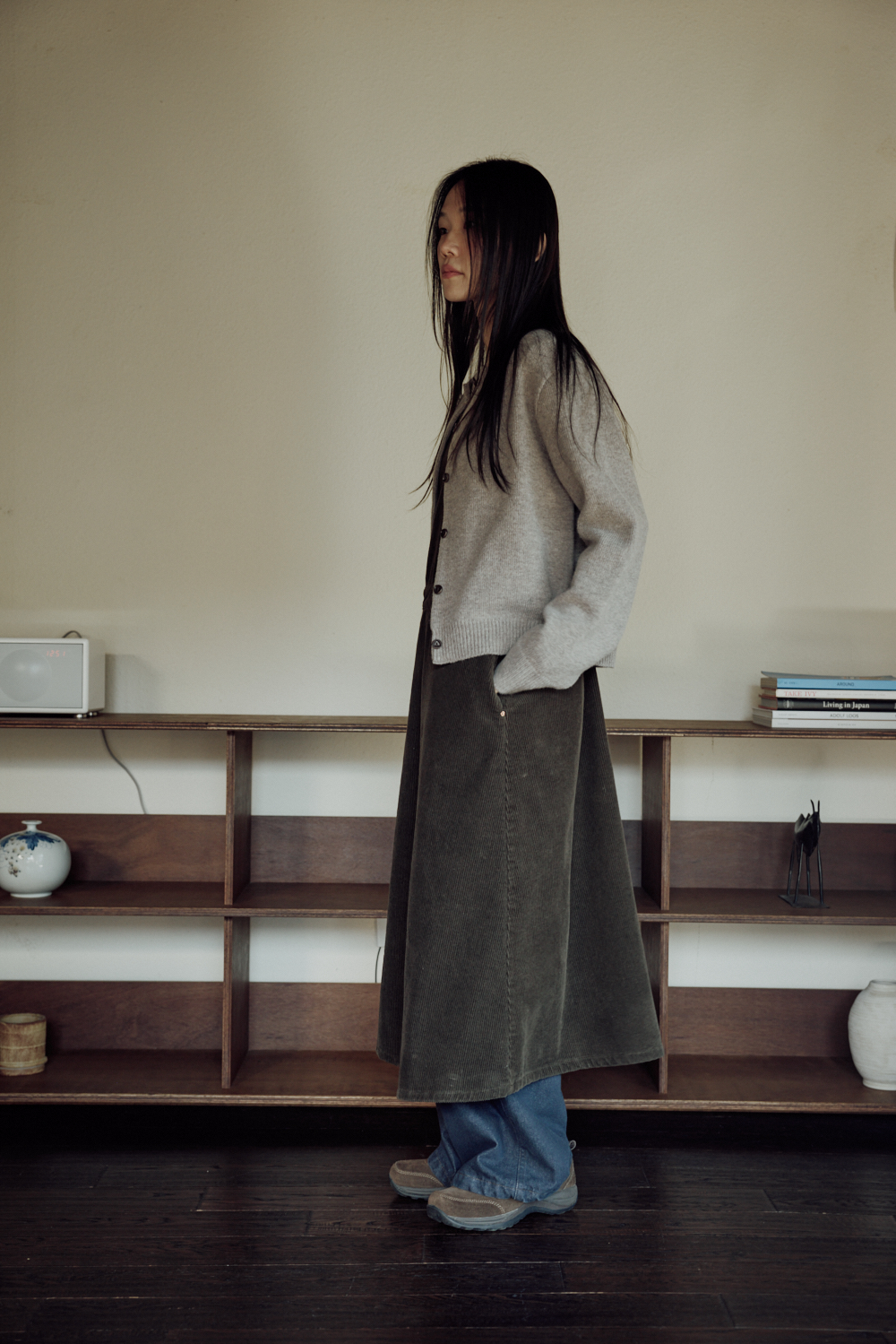 여유 있게 떨어지는 A라인 실루엣에, 작은 소지품을 수납할 수 있는 가슴 입술 포켓과 리얼 소뿔 단추를 더해 완성했습니다.