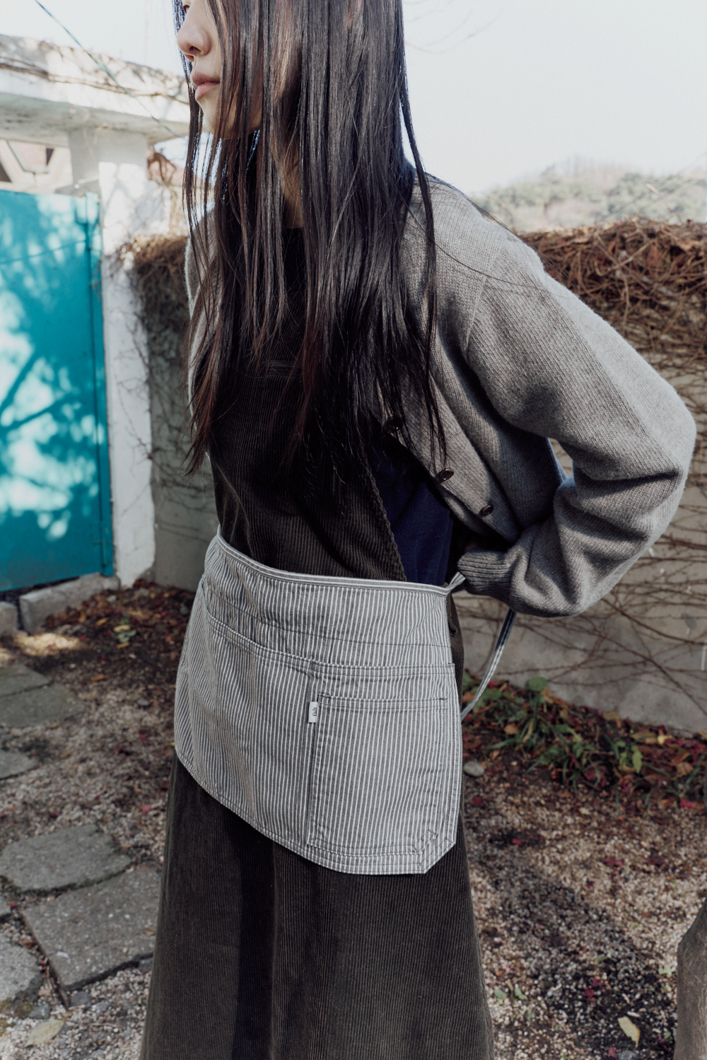 스트랩은 등쪽에서 교차되어 허리 안쪽 단추로 고정되며,두 단계 길이 조절과 고정 고리를 더해 안정적인 착용감을 제공합니다.