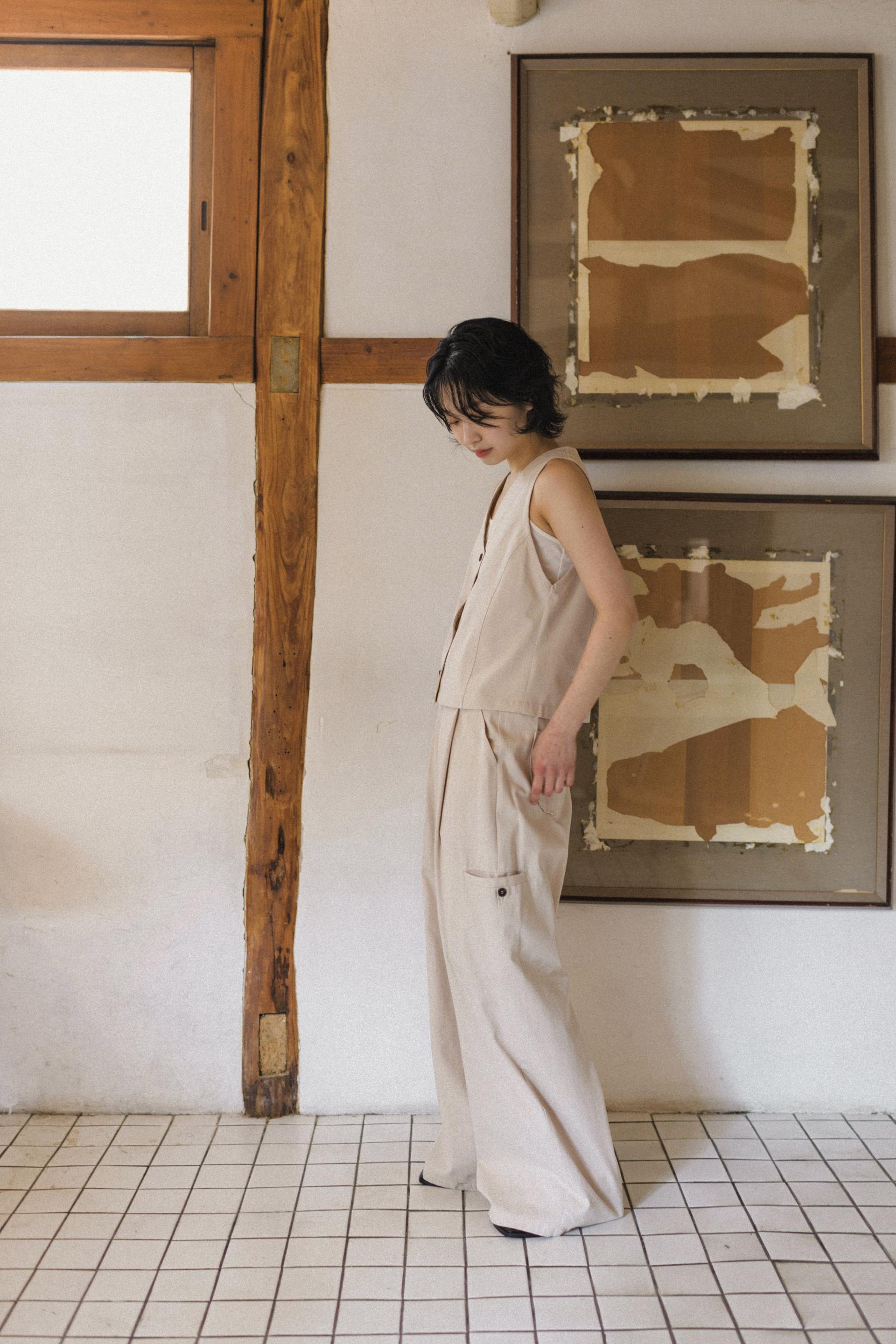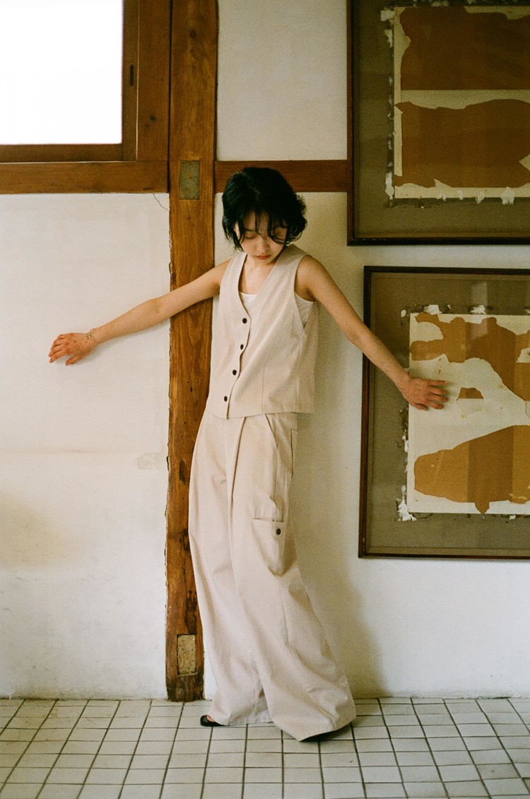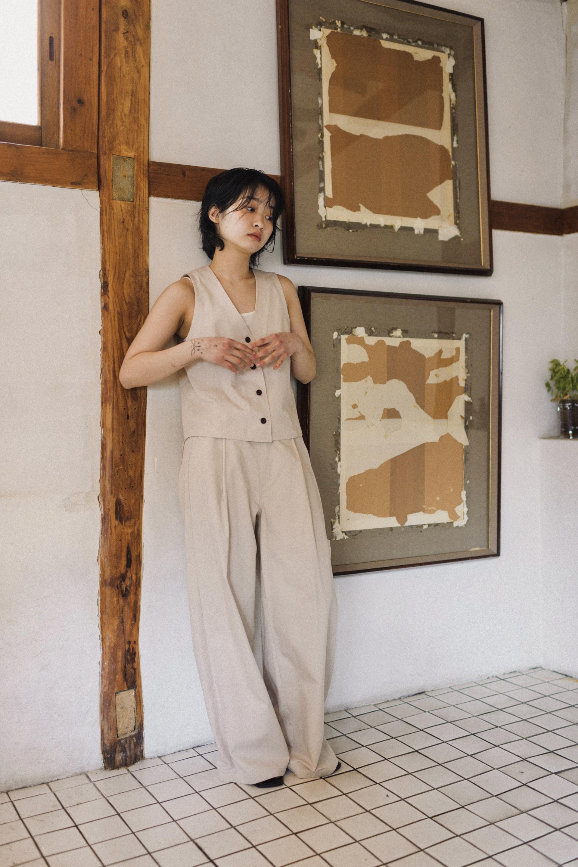 셋업 구성으로 제작된 V넥 베스트와 함께 착용시 잘 갖춰입은 듯 고급스러운 무드를 살려줍니다.