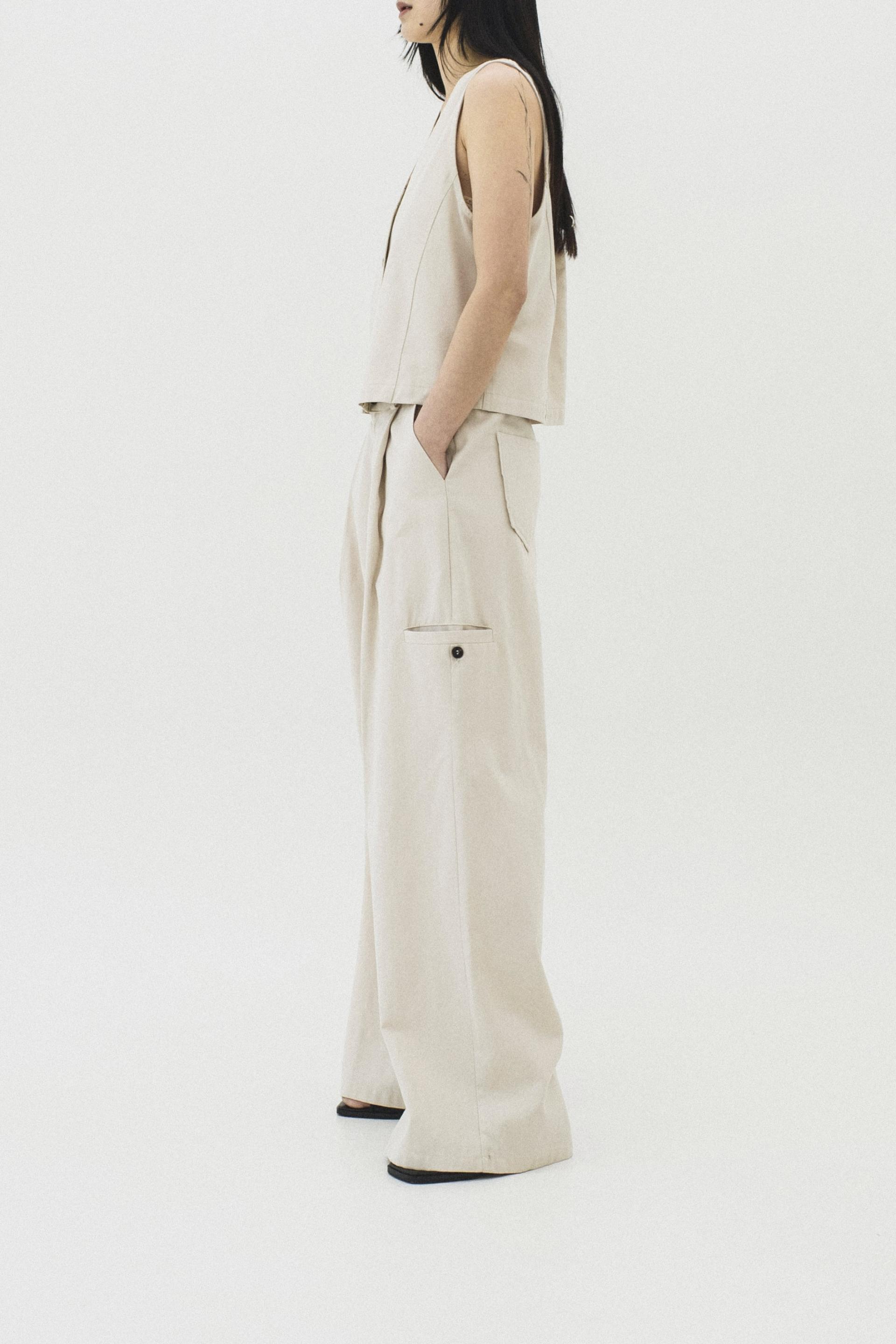 골반위로 툭 떨어지는 과하지 않은 로우웨스트입니다. 뒤가 들뜨지 않도록 허리를 감싸주는 라운드 패턴을 사용했으며, 사이드 인포켓어 버튼을 달아 실용성과 더불어 디자인 포인트 요소가 되어줍니다.